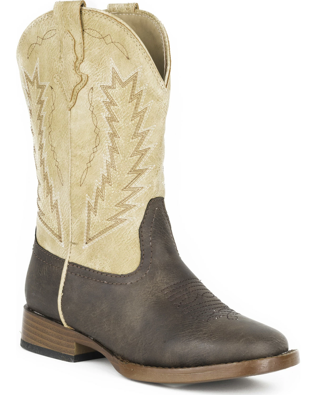 He’ll be the most handsome young cowboy around in his Roper Billy Arrowhead Cowboy Boots. These boots have great western style with their brown and tan upper, fancy arrowhead stitch pattern and pull tab overlays. The flexible outsole and padded insole will ensure his comfort in or out of the saddle. He’ll always look his western best with Roper.