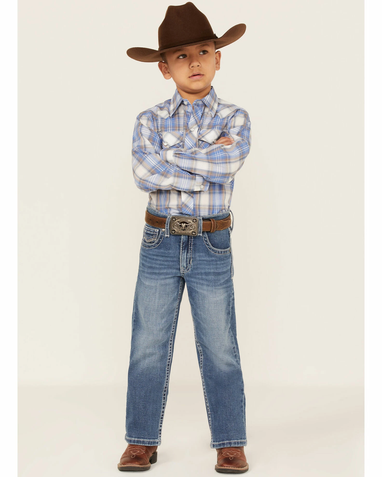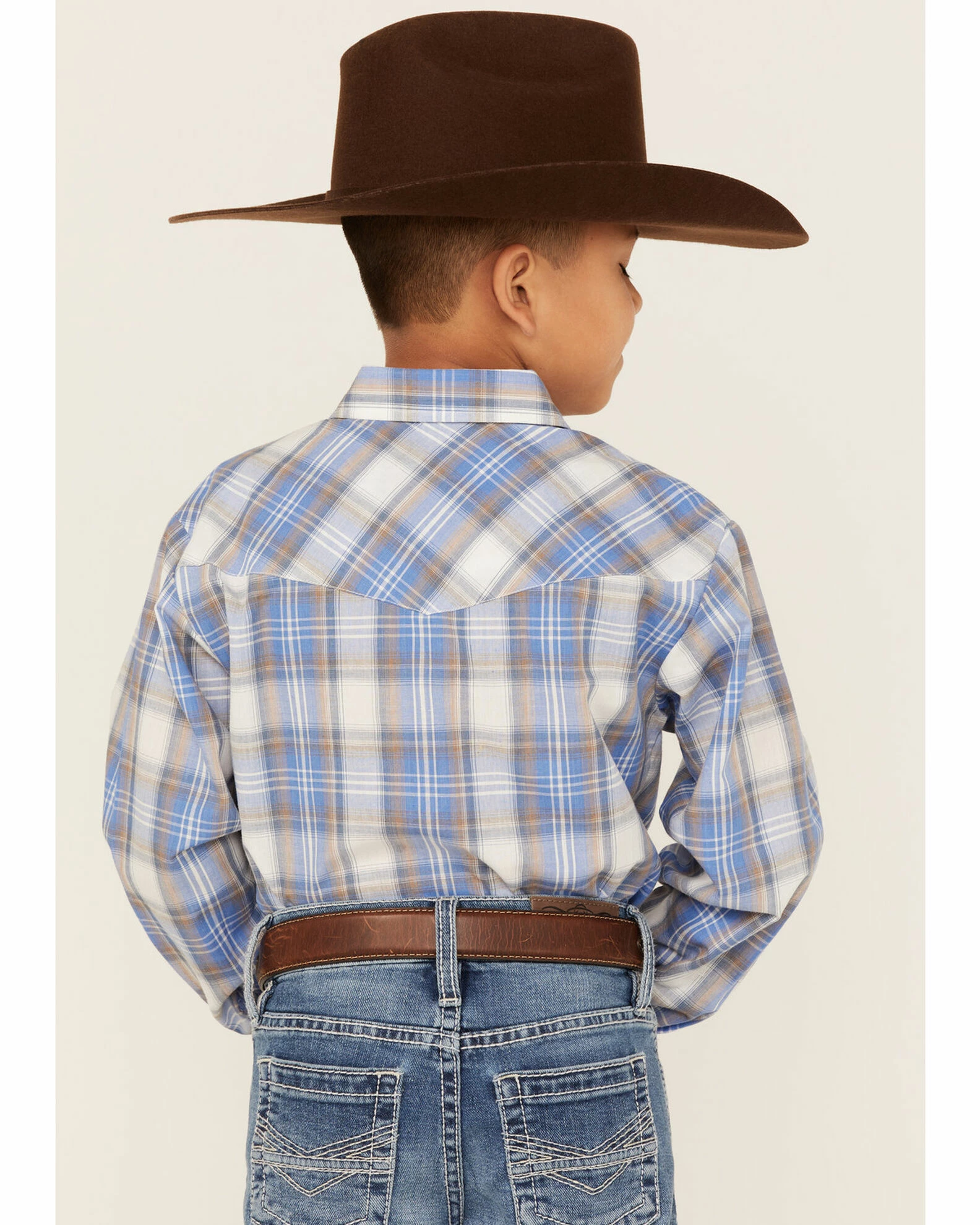 Roper Boys’ Classic Plaid Print Long Sleeve Western Snap Shirt Blue