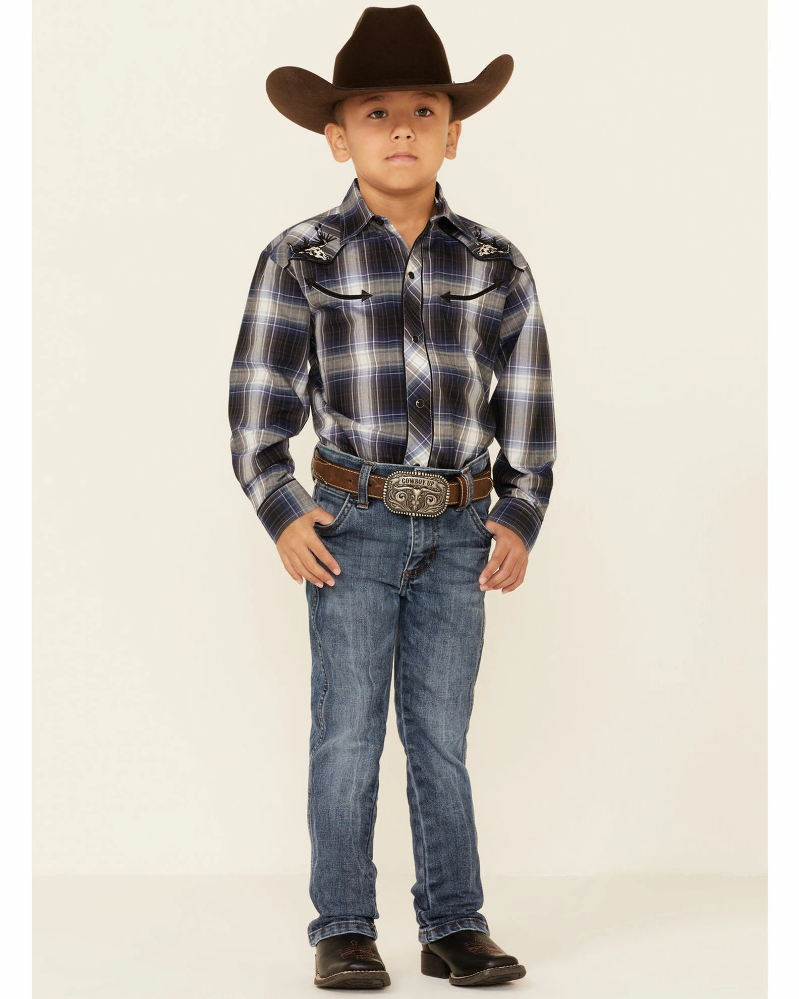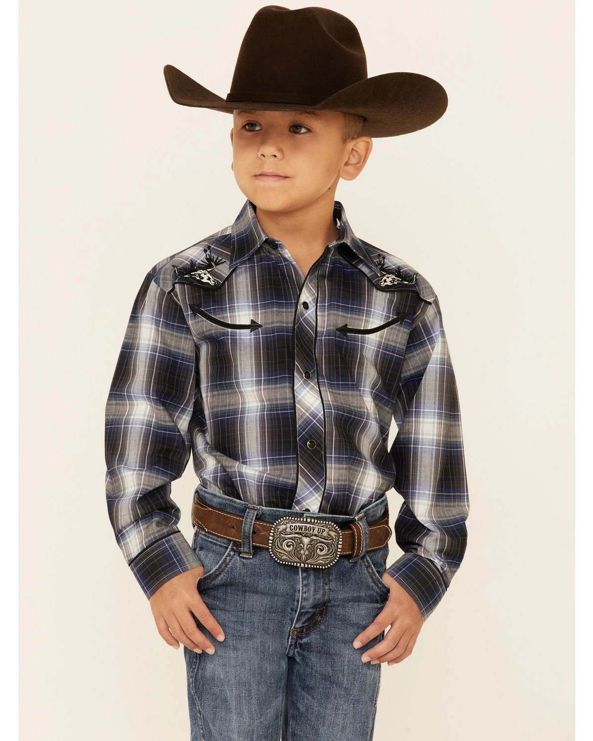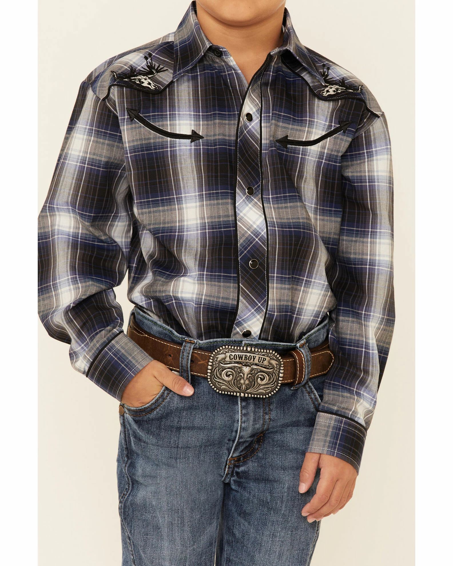 Roper Boys’ Plaid Embroidered Long Sleeve Snap Western Shirt Blue