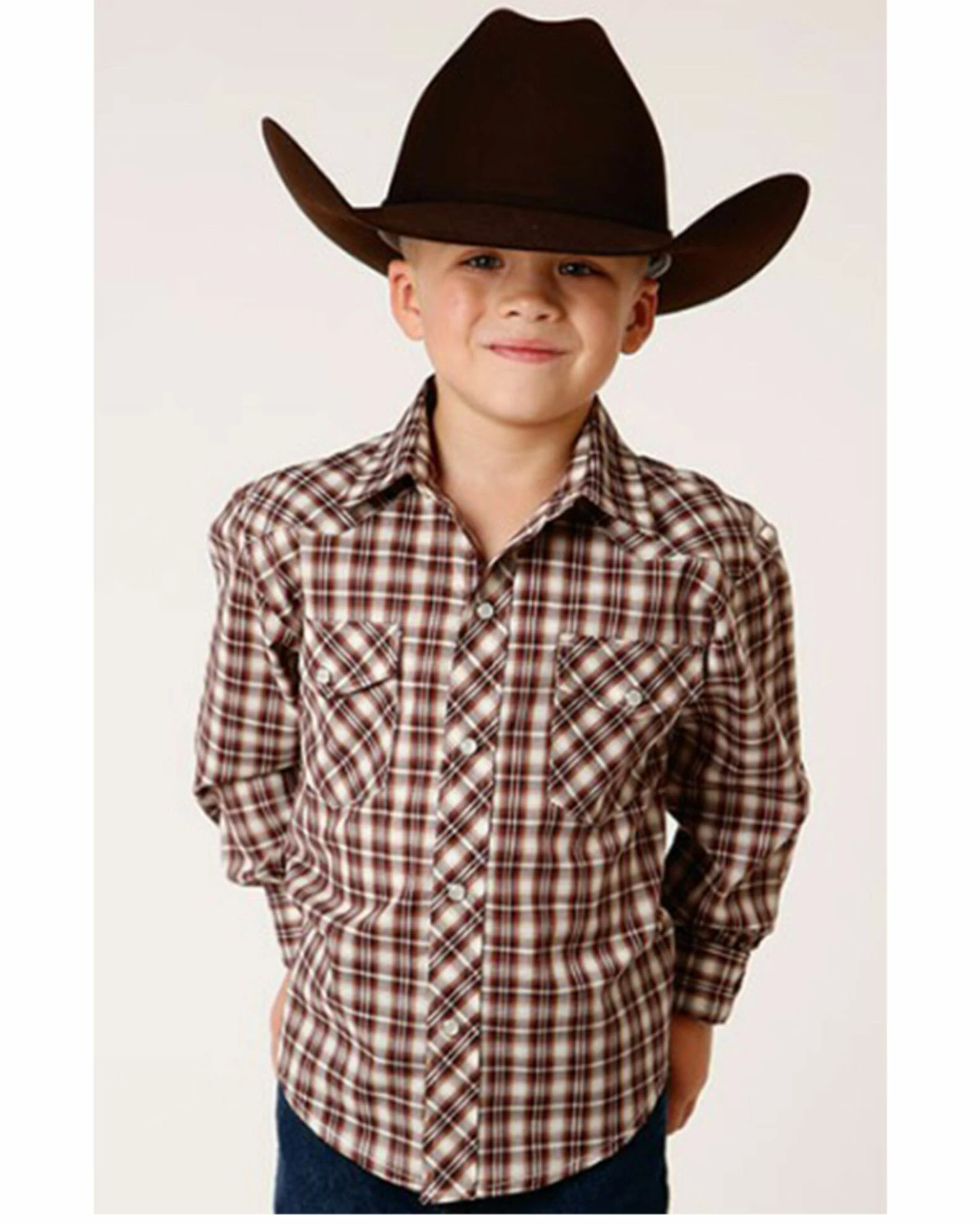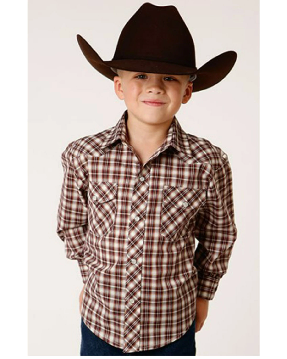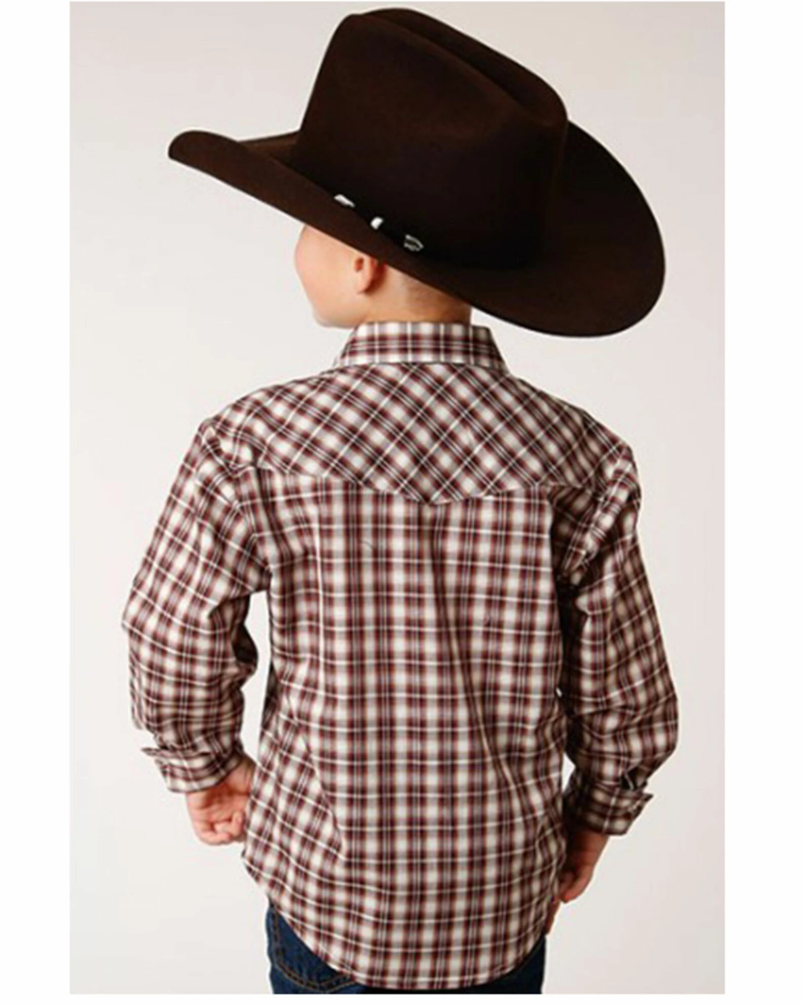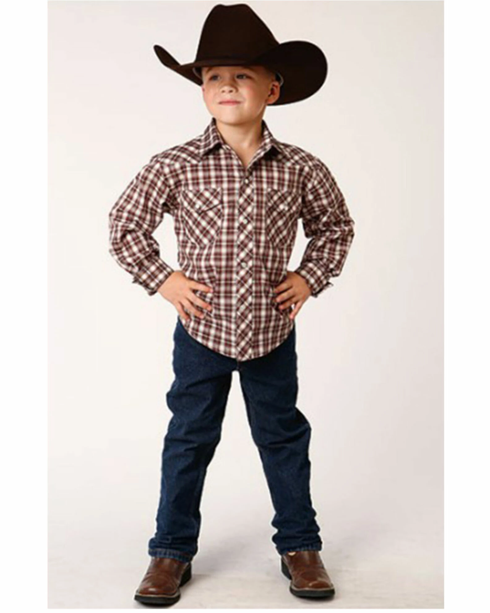 Roper Boys’ Plaid Print Cowboy Embroidery Long Sleeve Snap Western Shirt Burgundy