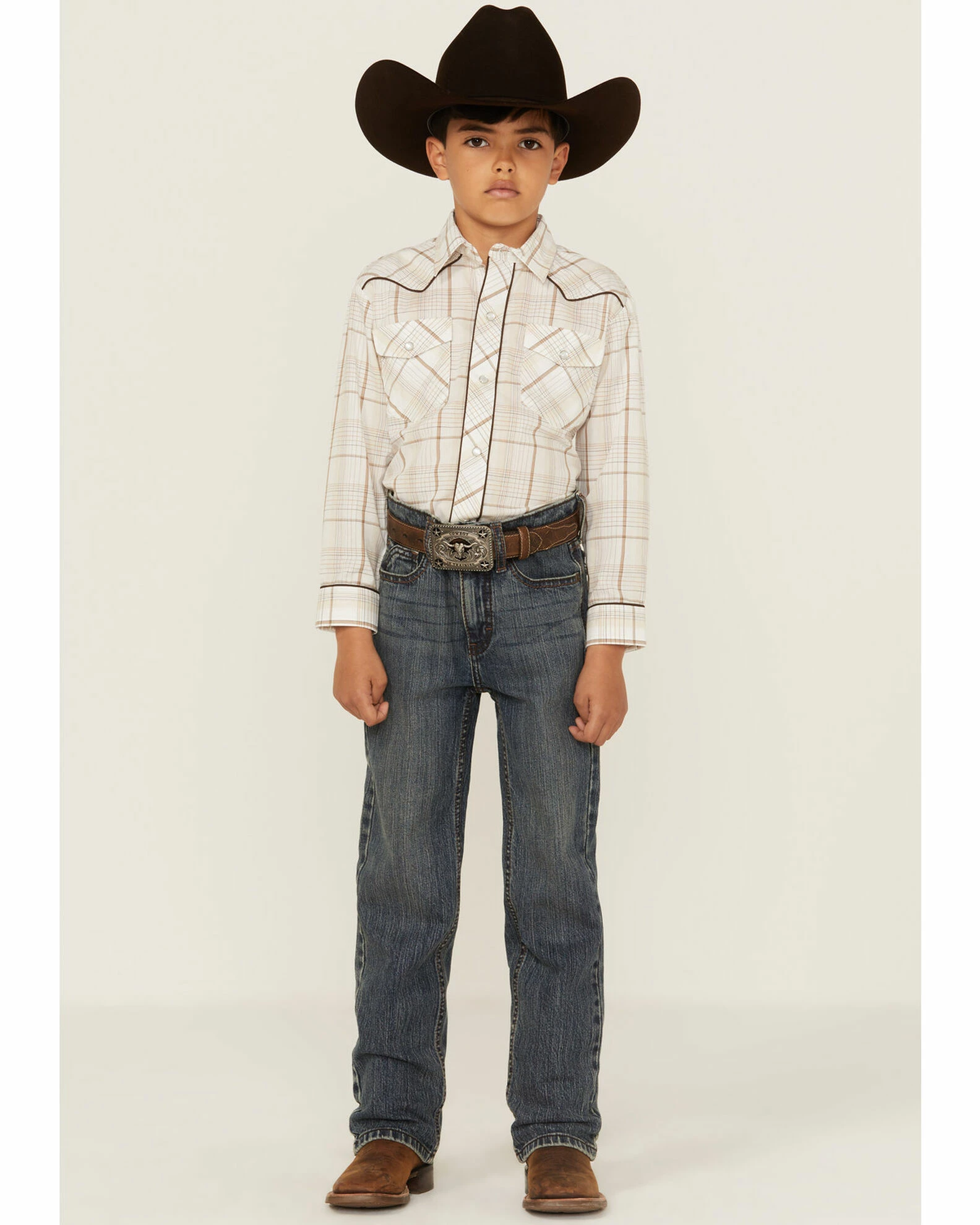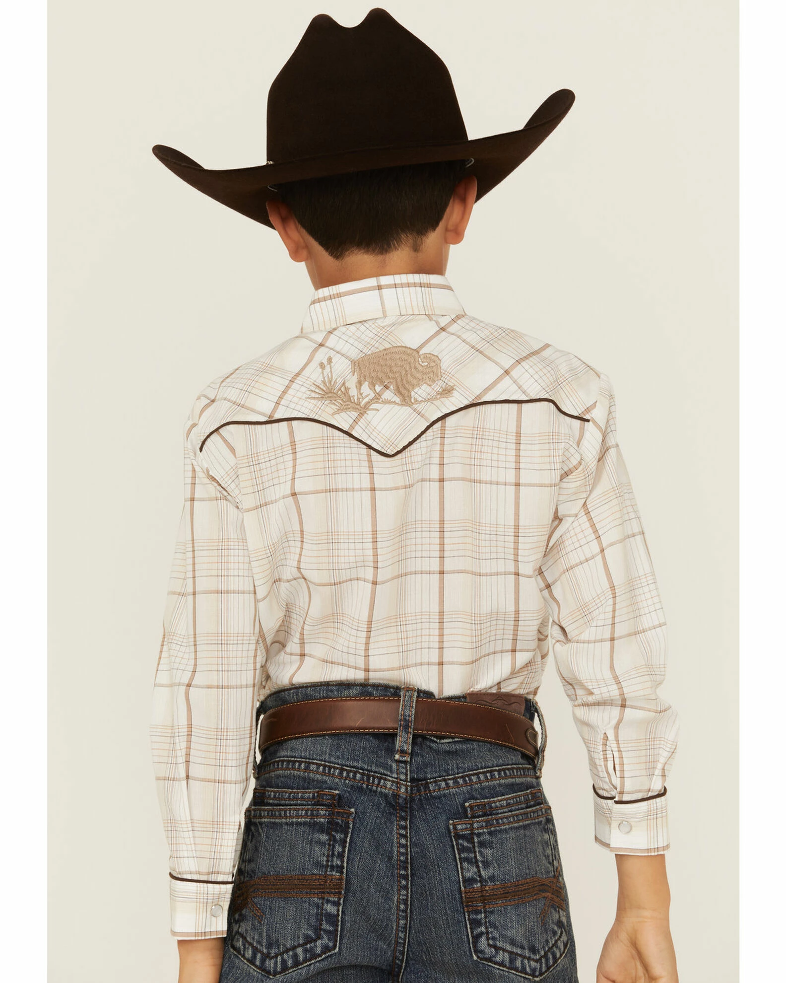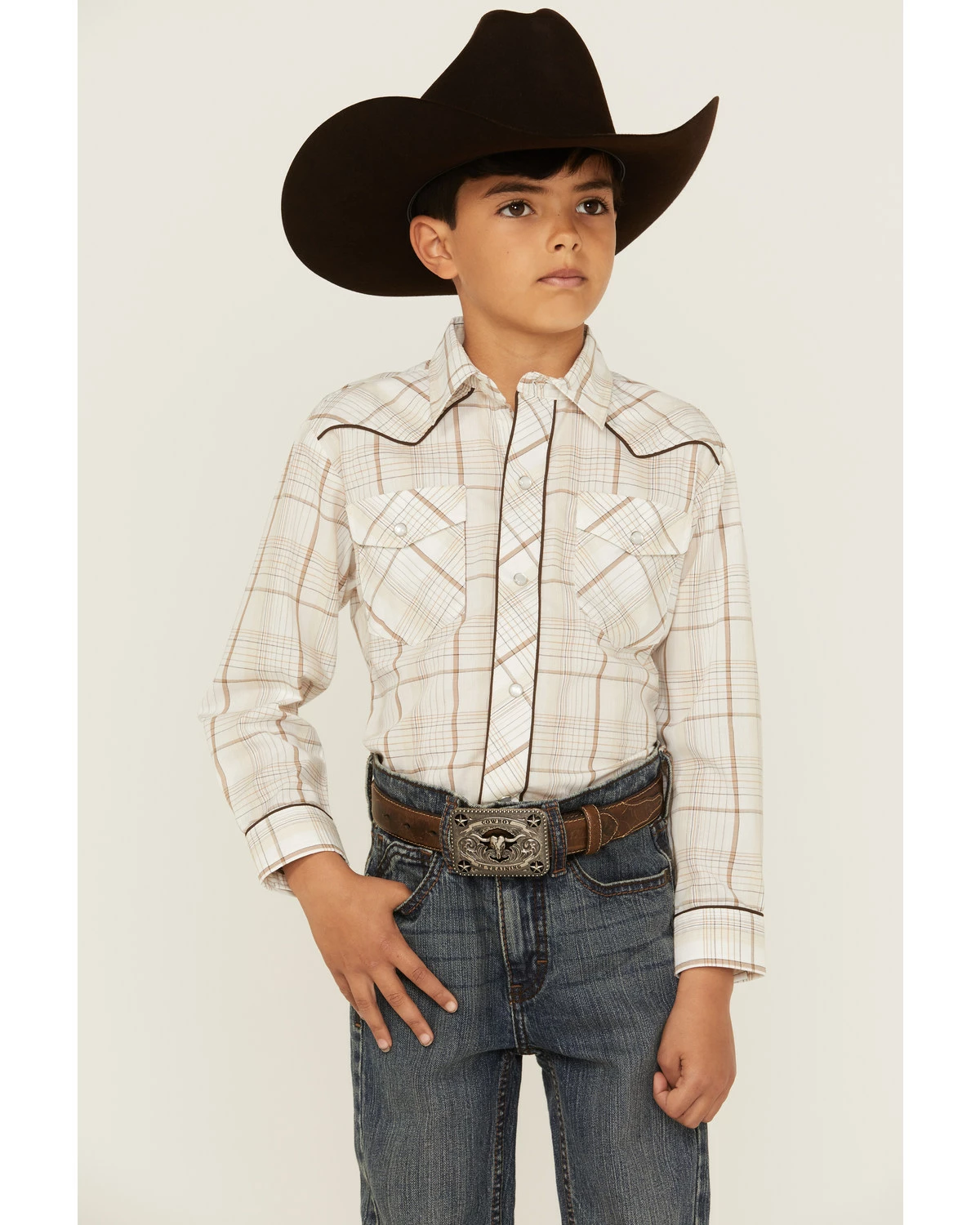 Roper Boys’ Plaid Print Embroidered Long Sleeve Western Snap Shirt Brown