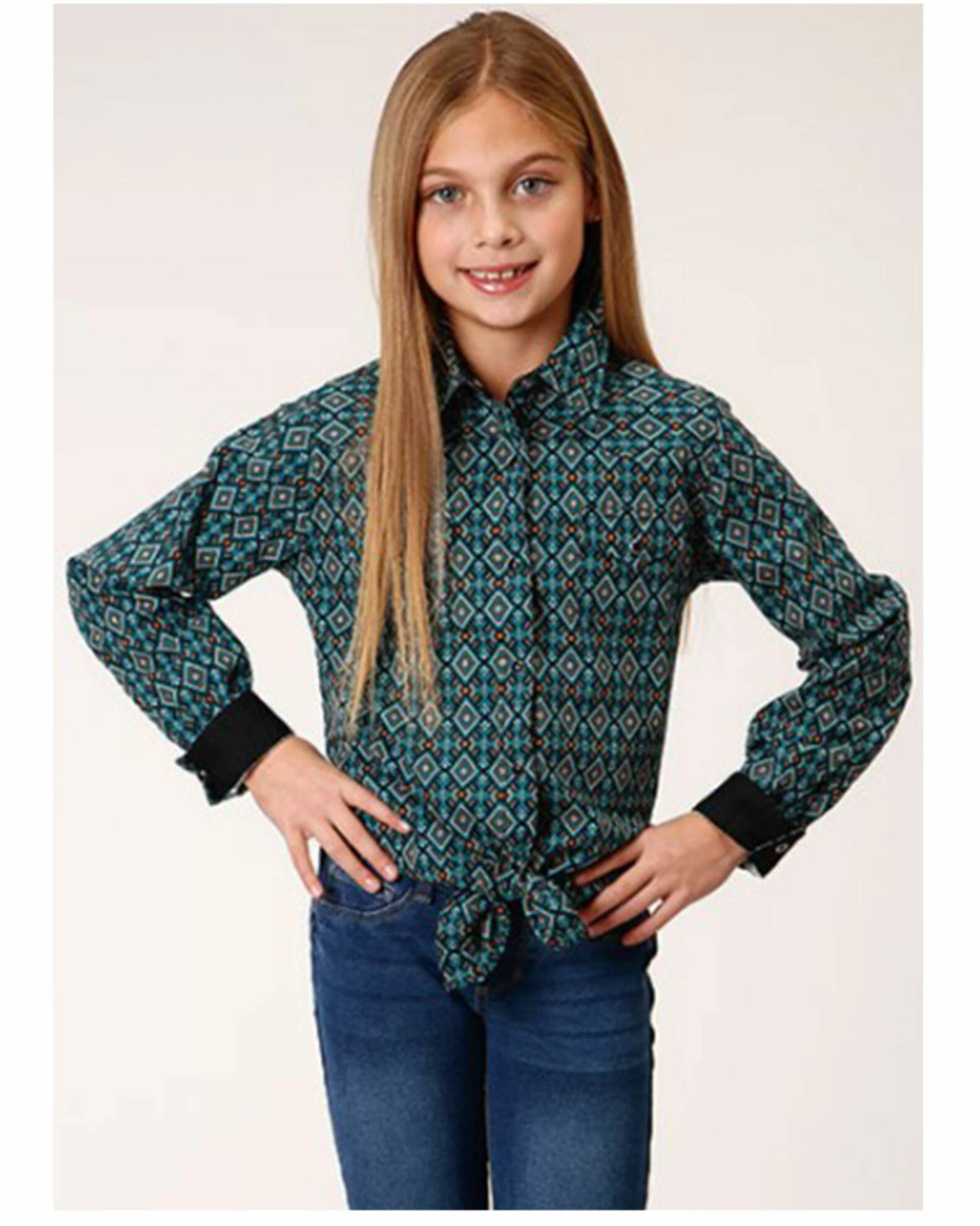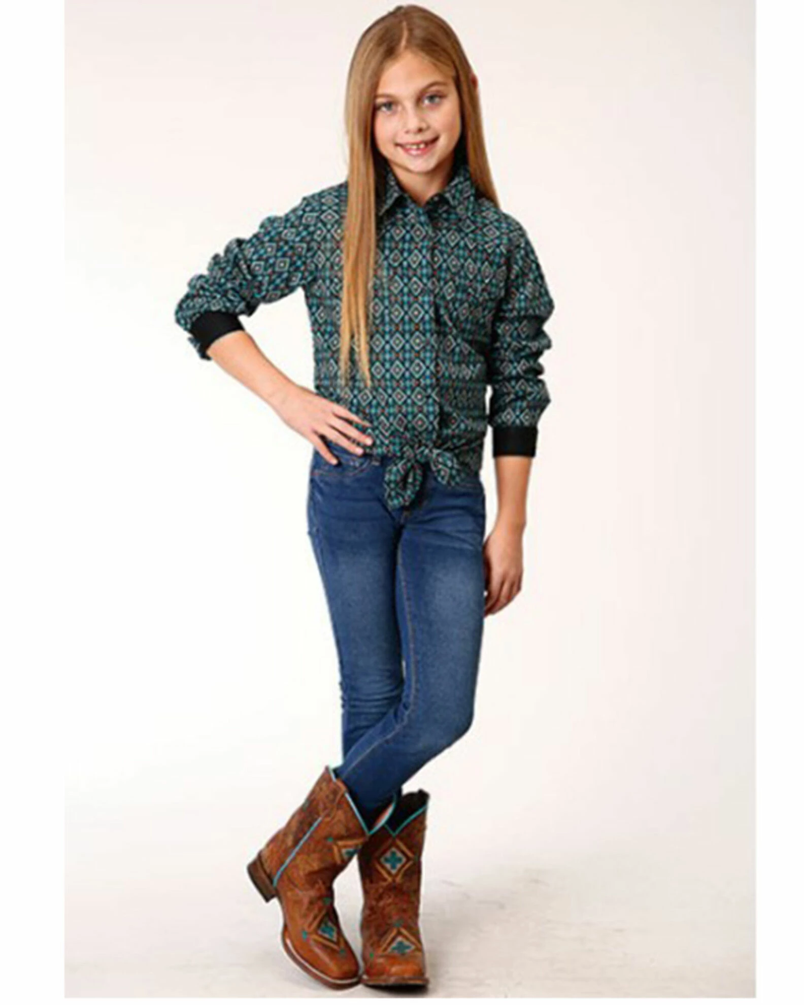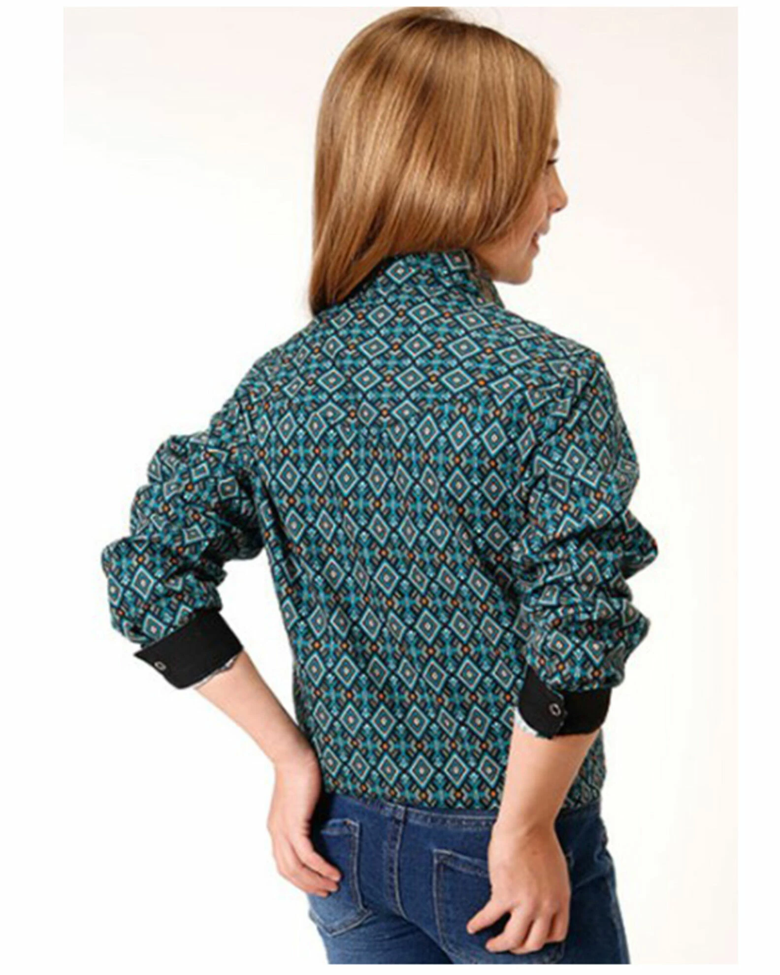 Roper Girls’ Geo Print Long Sleeve Snap Western Shirt Teal