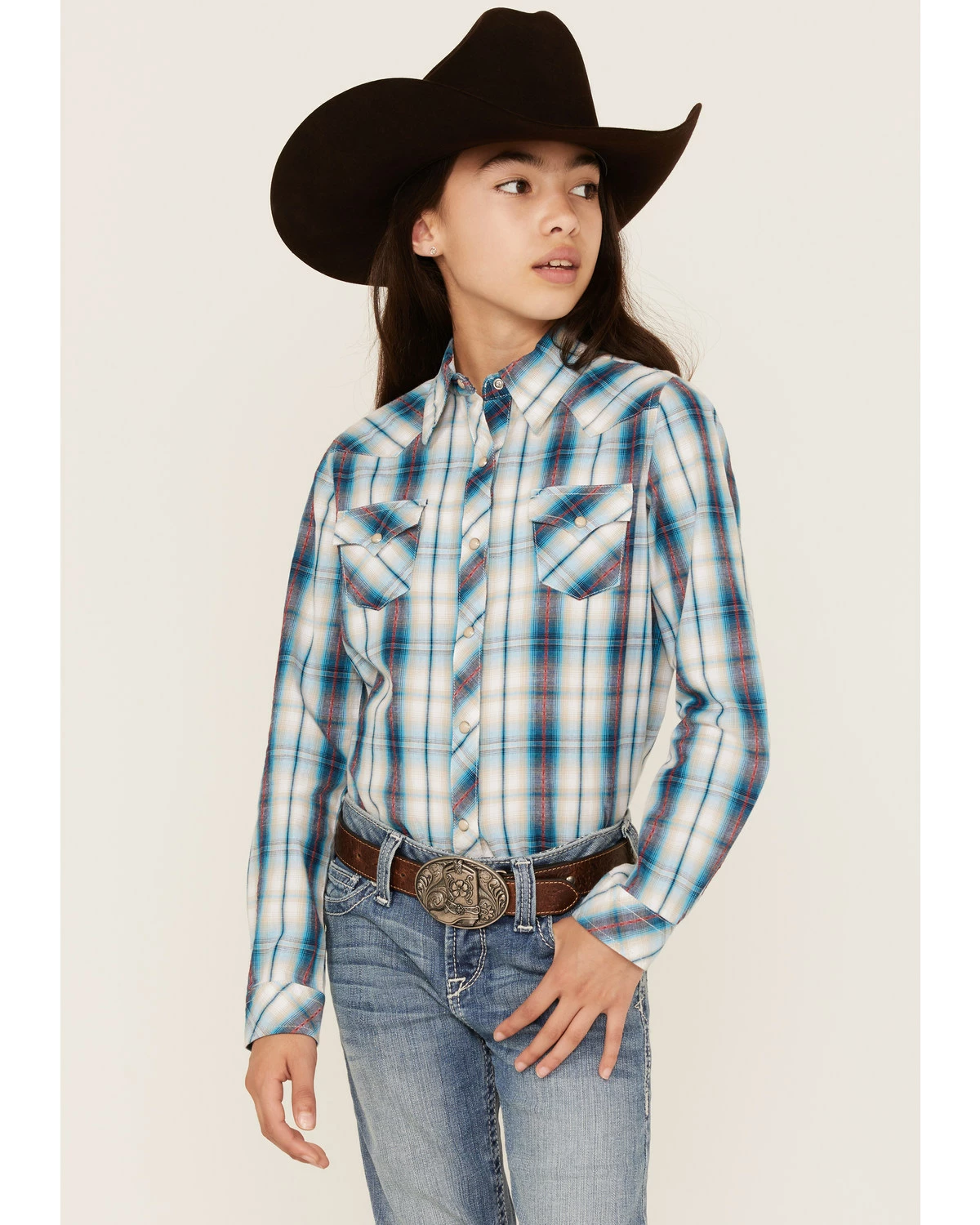 Roper Girls’ West Made Plaid Print Long Sleeve Western Snap Shirt Blue