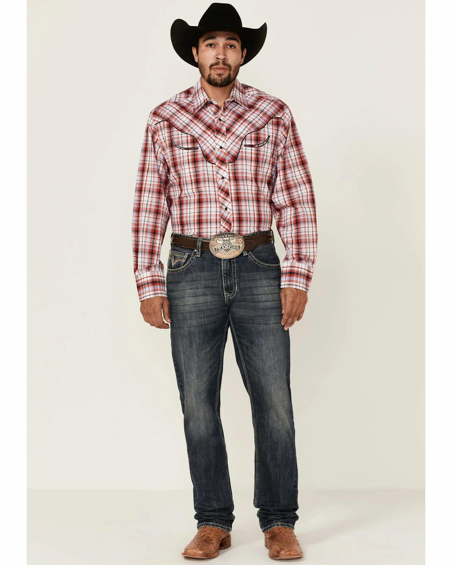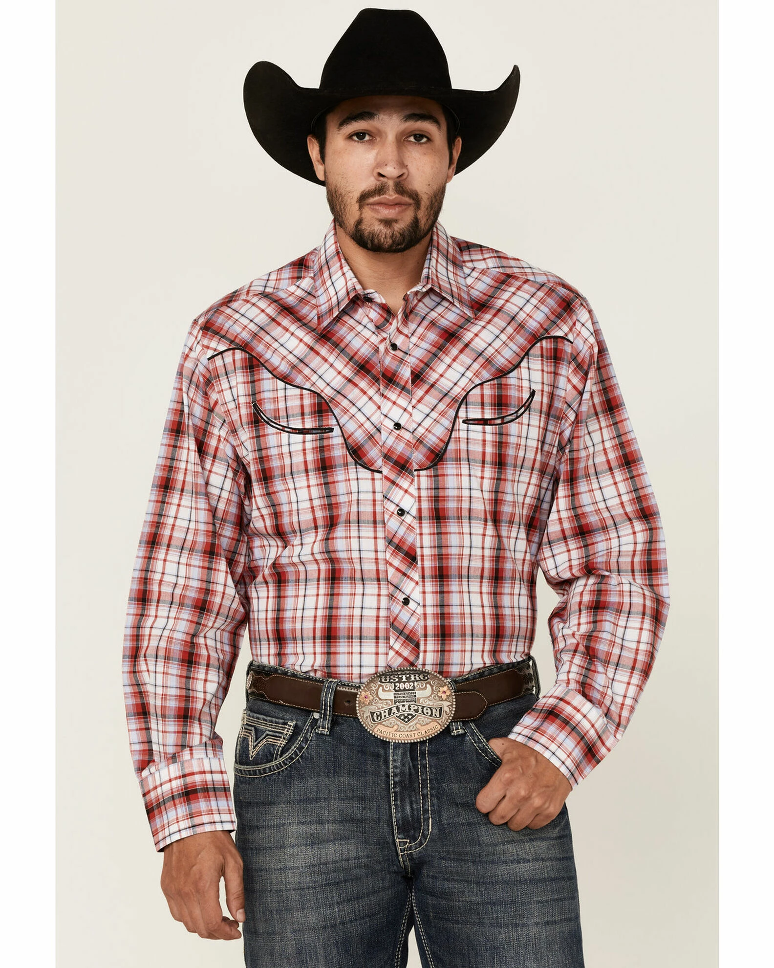 Roper Men’s Red Plaid Embroidered Applique Long Sleeve Snap Western Shirt