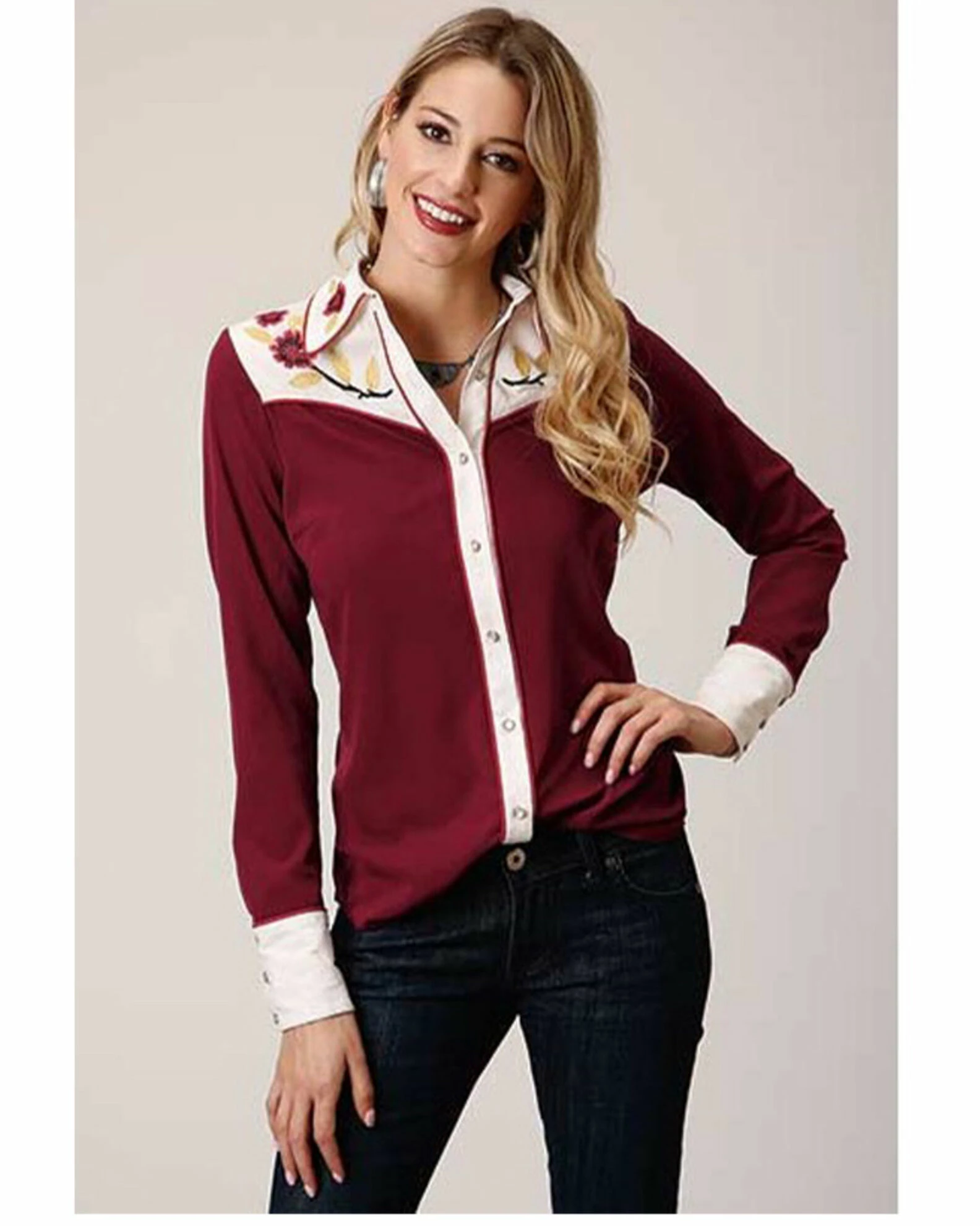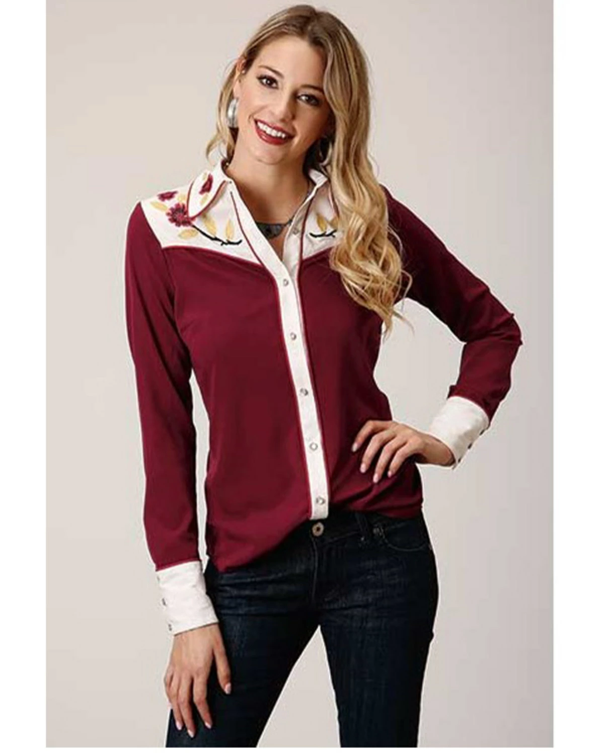 Roper Studio West Women’s Red Vintage Floral Embroidered Long Sleeve Western Shirt