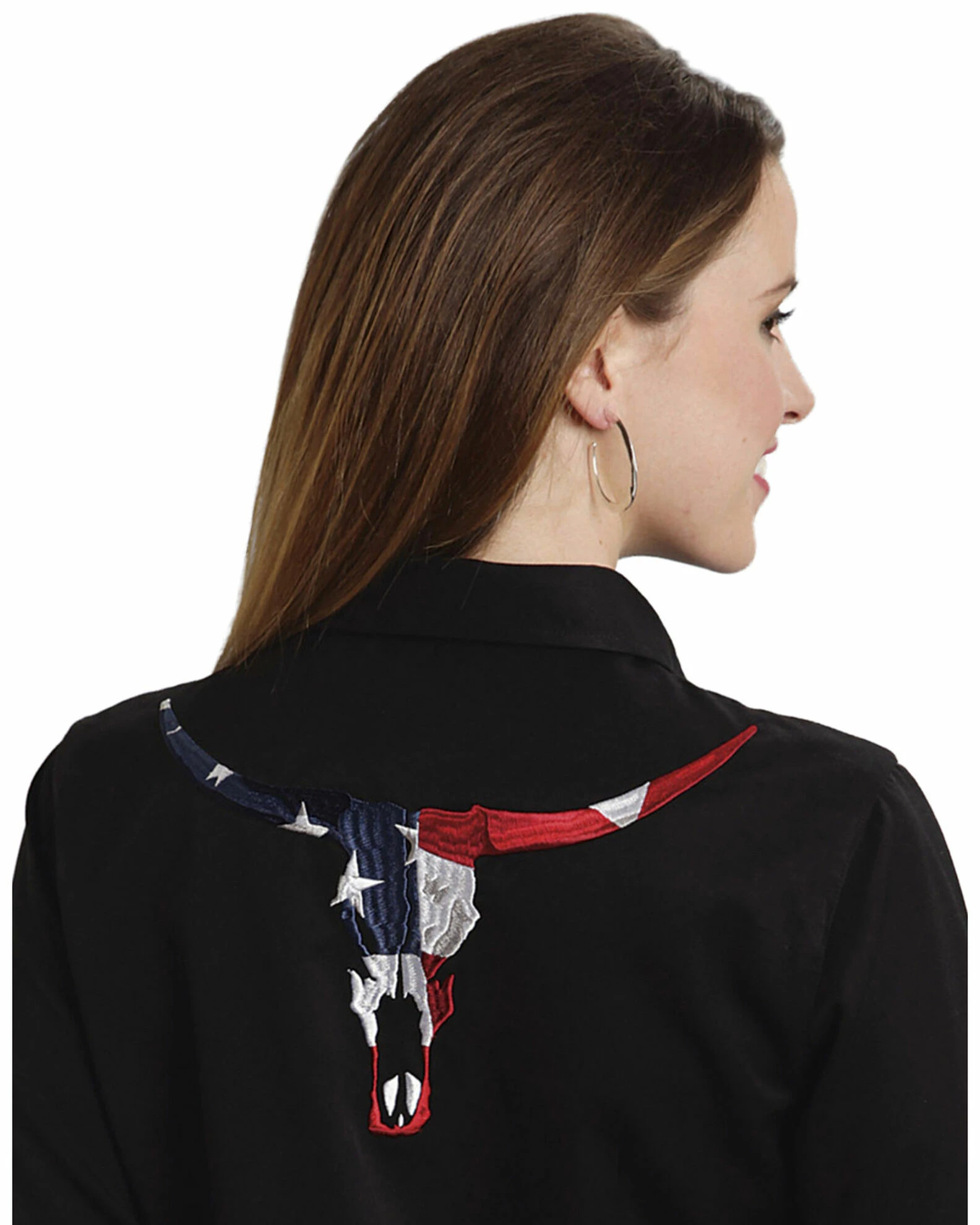 This women’s vintage-inspired western shirt is made of solid black cotton twill with white piping, arrow-slit chest pockets, pearl snap details, and a tailored fit. An embroidered American flag-filled longhorn skull applique adorns the back yoke of this fun western shirt by Roper.
