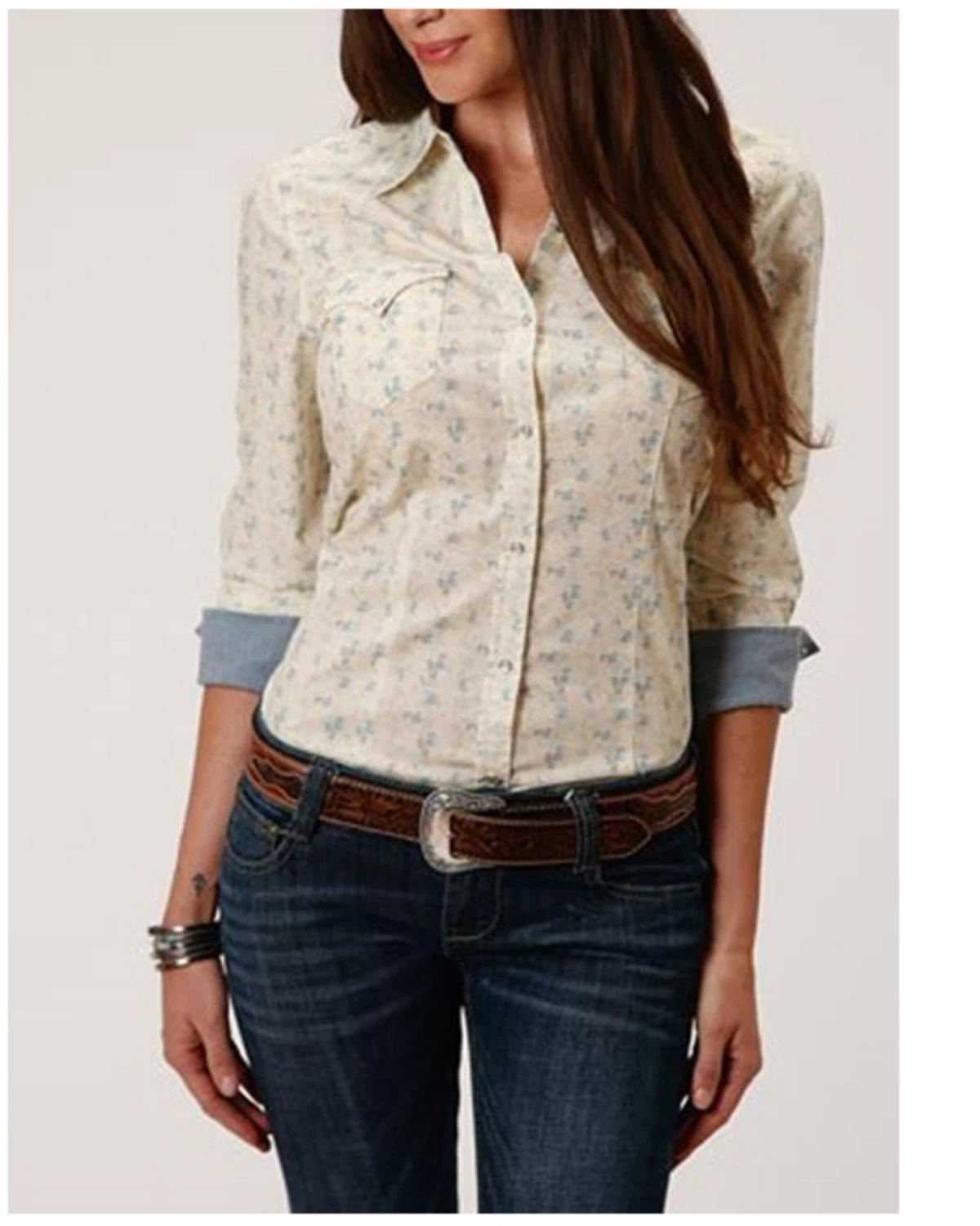 Roper Women’s Floral Print Long Sleeve Snap Western Shirt – Plus Cream