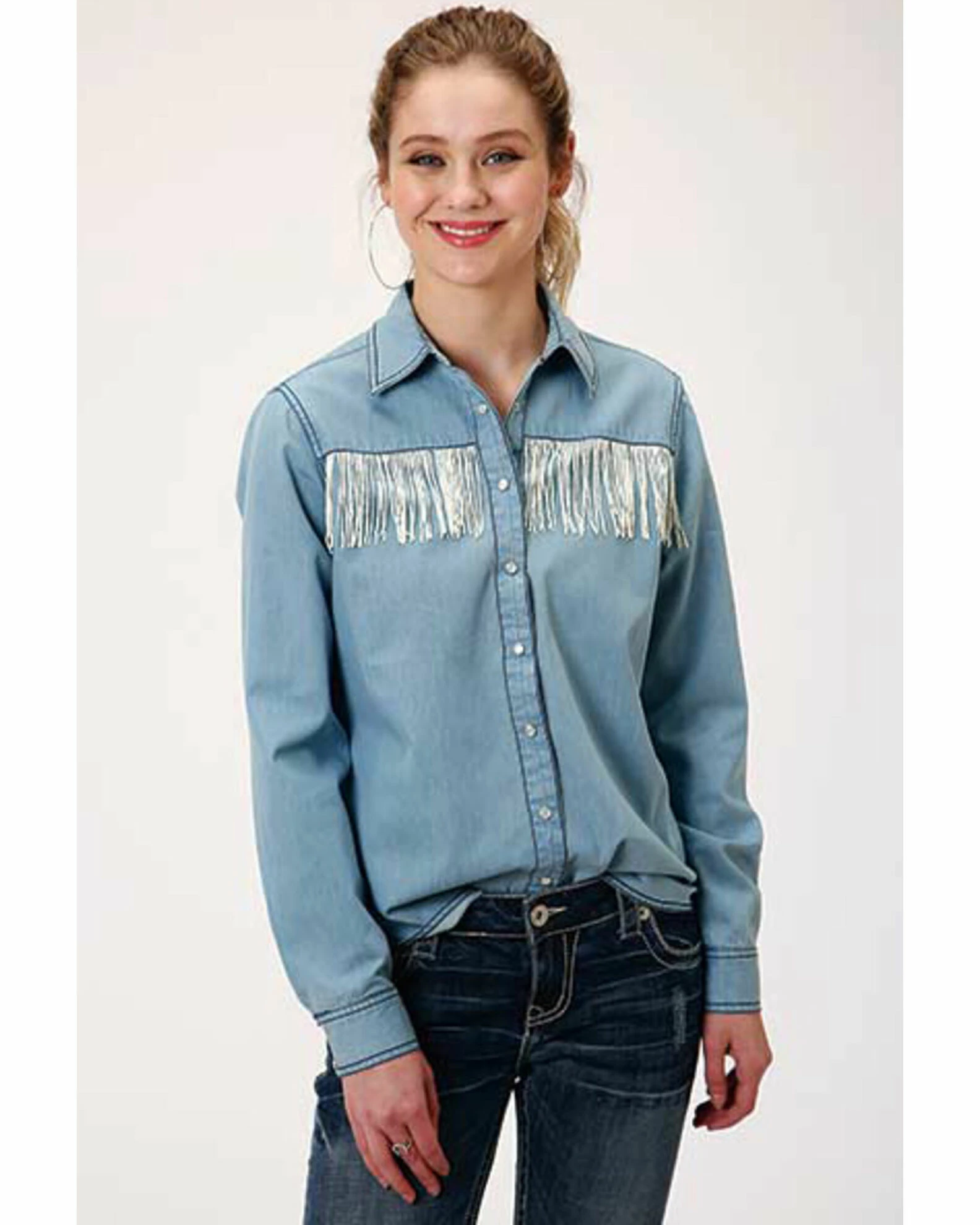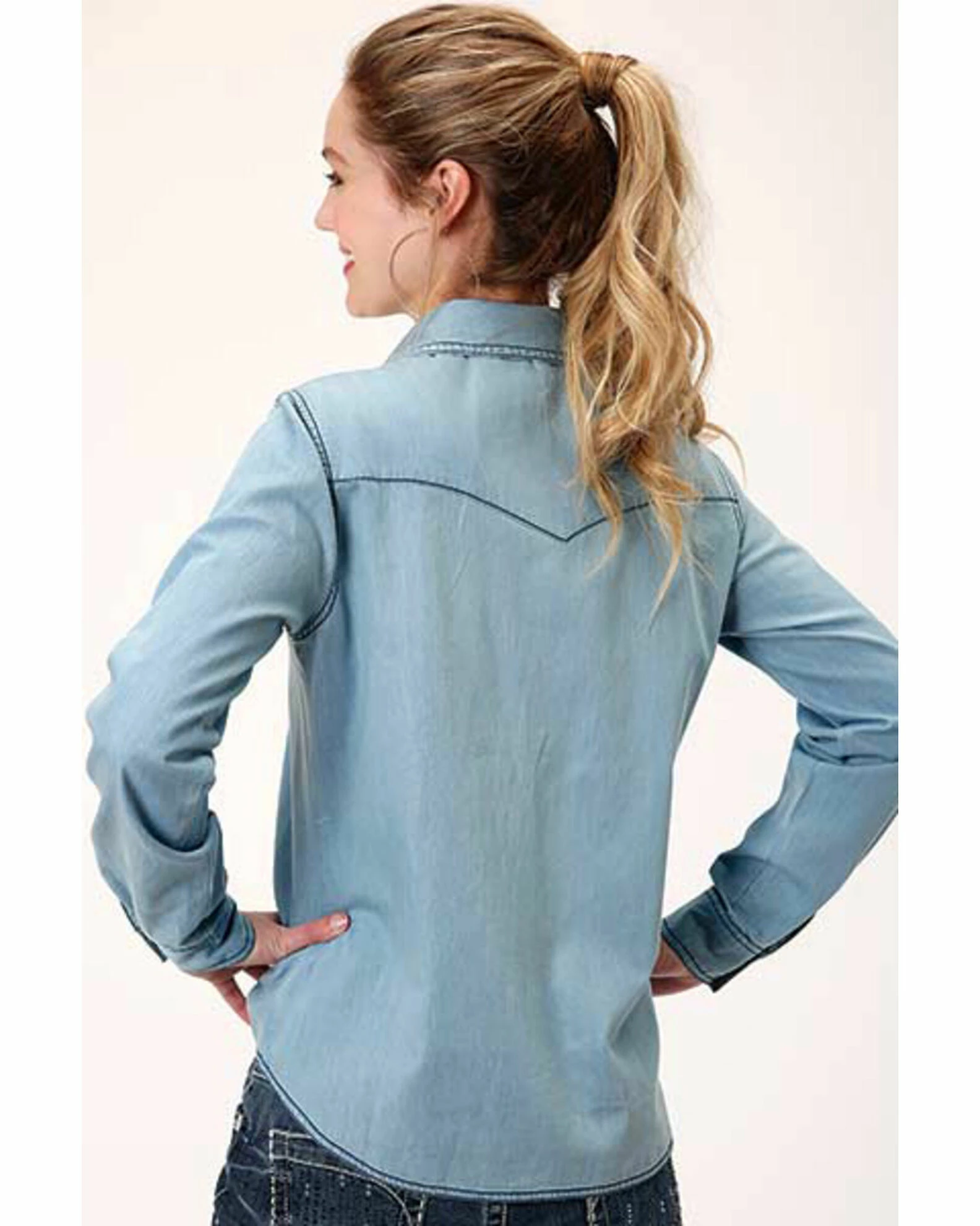 Roper Women’s Light Wash Long Sleeve Snap Western Core Denim Shirt Blue