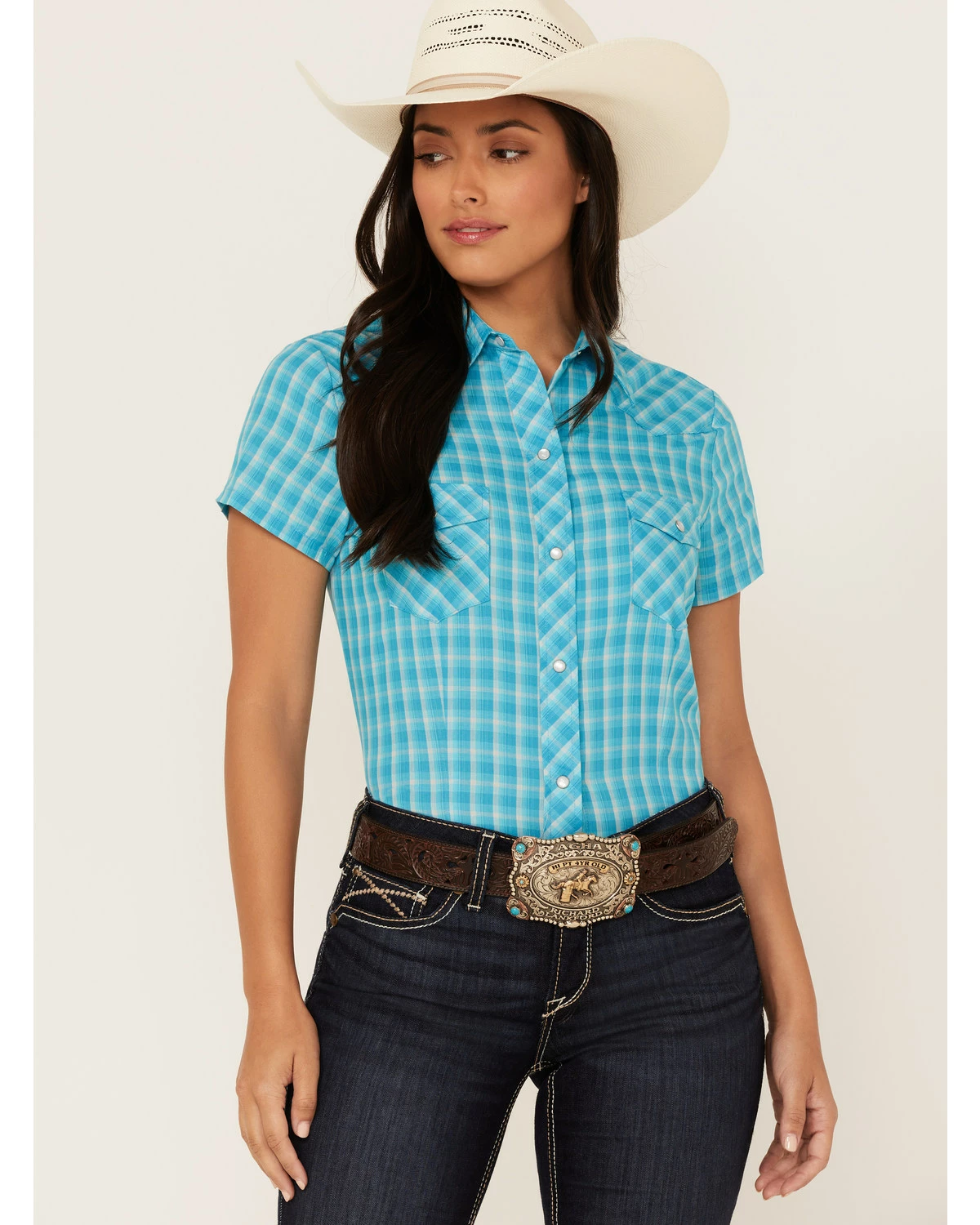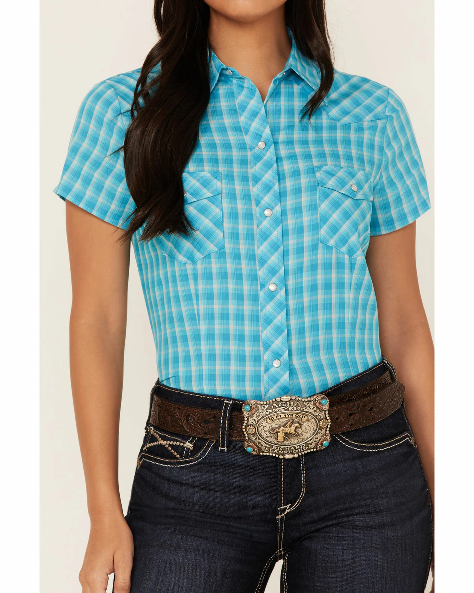 Roper Women’s Plaid Print Short Sleeve Snap Western Shirt Teal