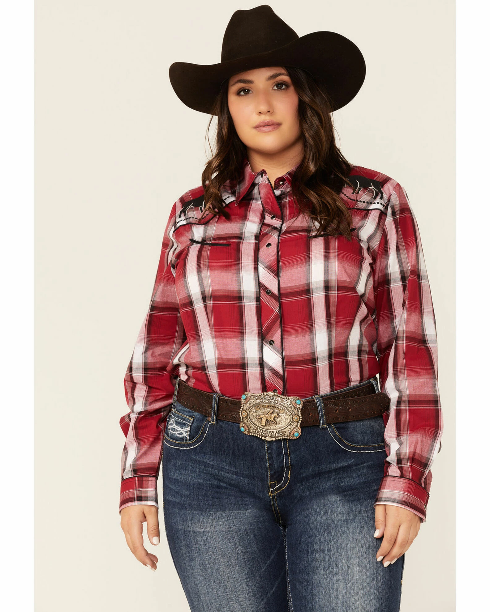 Roper Women’s Red Plaid Bull Embroidered Yoke Long Sleeve Snap Western Core Shirt – Plus