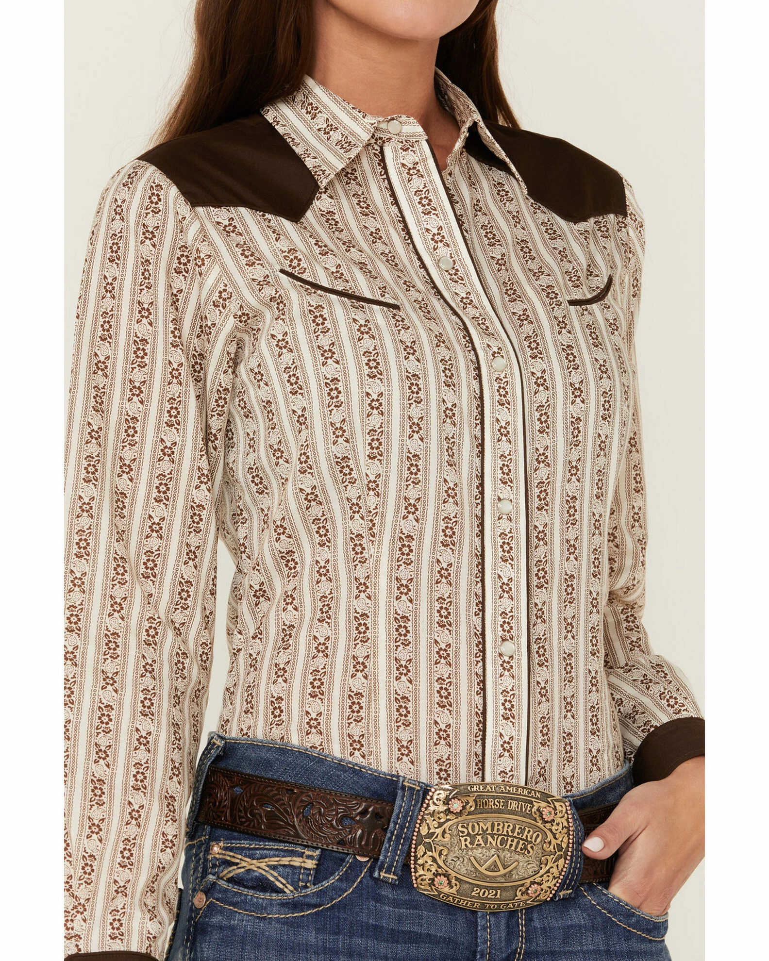 Roper Women’s Retro Floral Stripe Wallpaper Print Long Sleeve Western Snap Shirt Brown