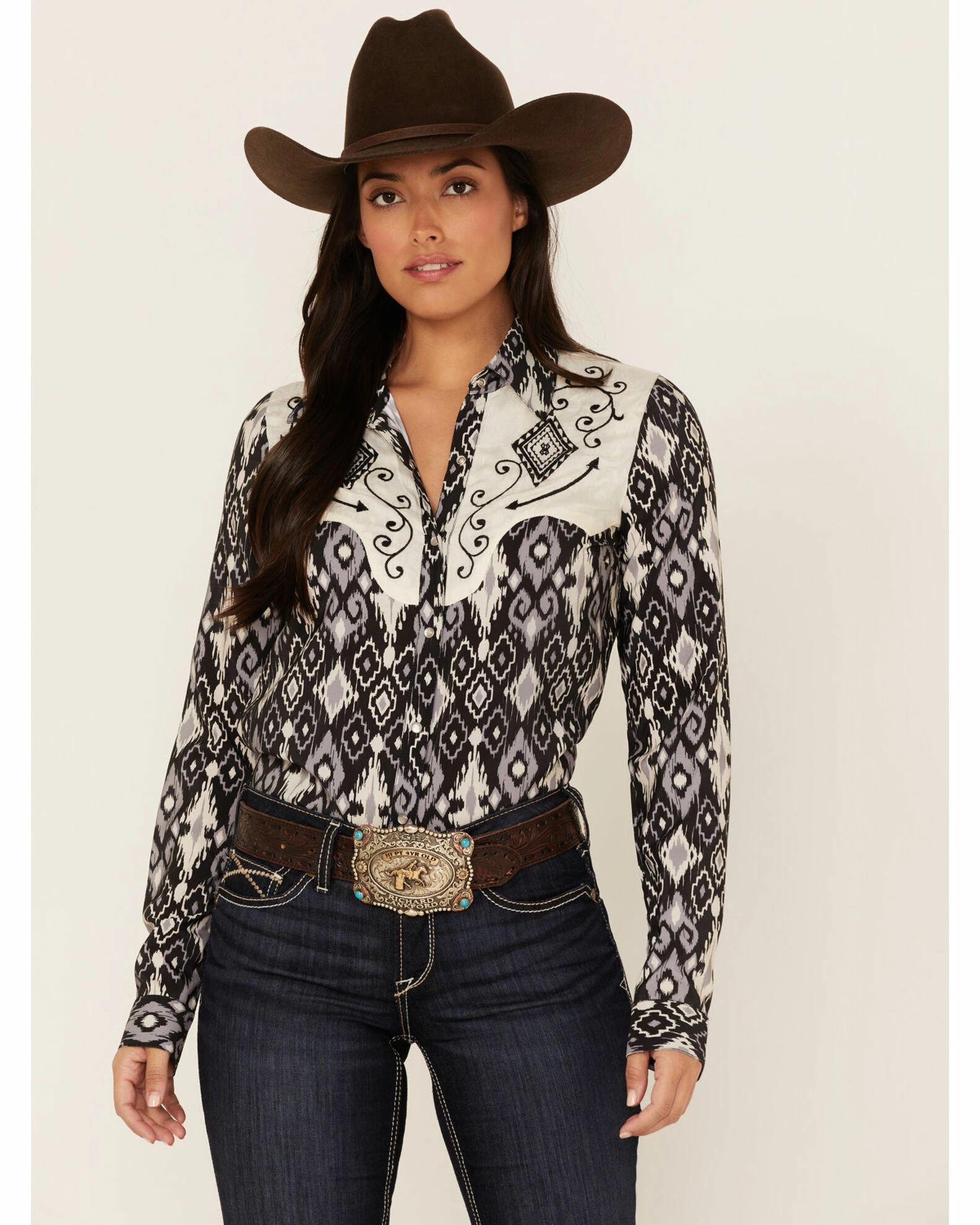 Roper Women’s Southwestern Diamond Print Long Sleeve Snap Western Shirt Black