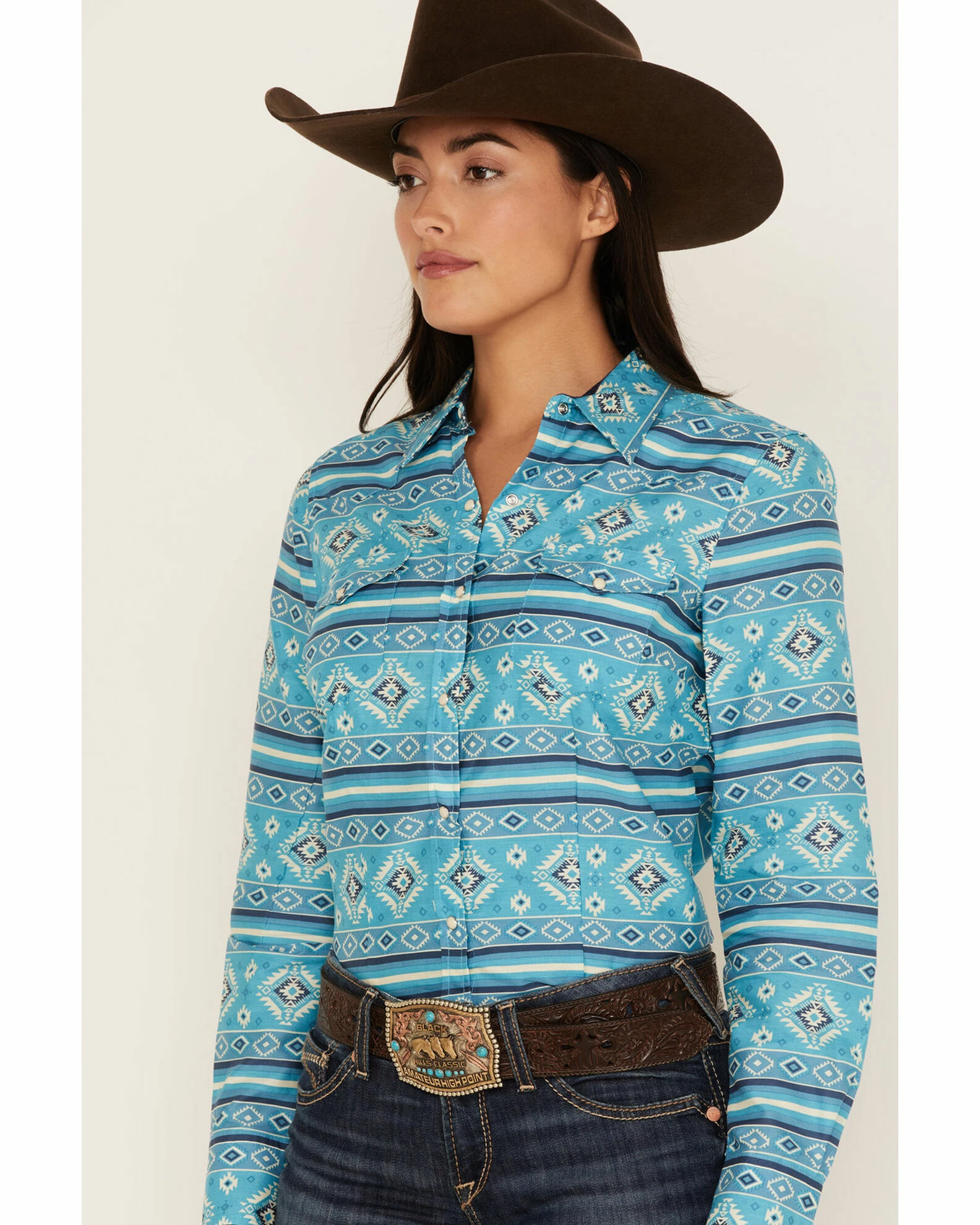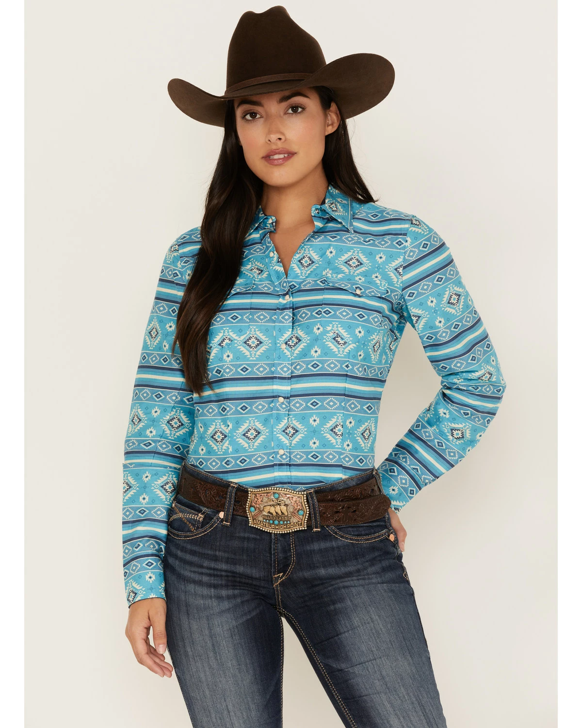 Roper Women’s Southwestern Stripe Print Long Sleeve Snap Western Shirt Blue