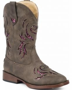 Boots from Roper are perfect for cowgirls of all ages. These western boots feature a striking pink glitter heart design on a distressed brown upper. No matter where she goes, your princess will look and feel like a country queen in these Roper boots.